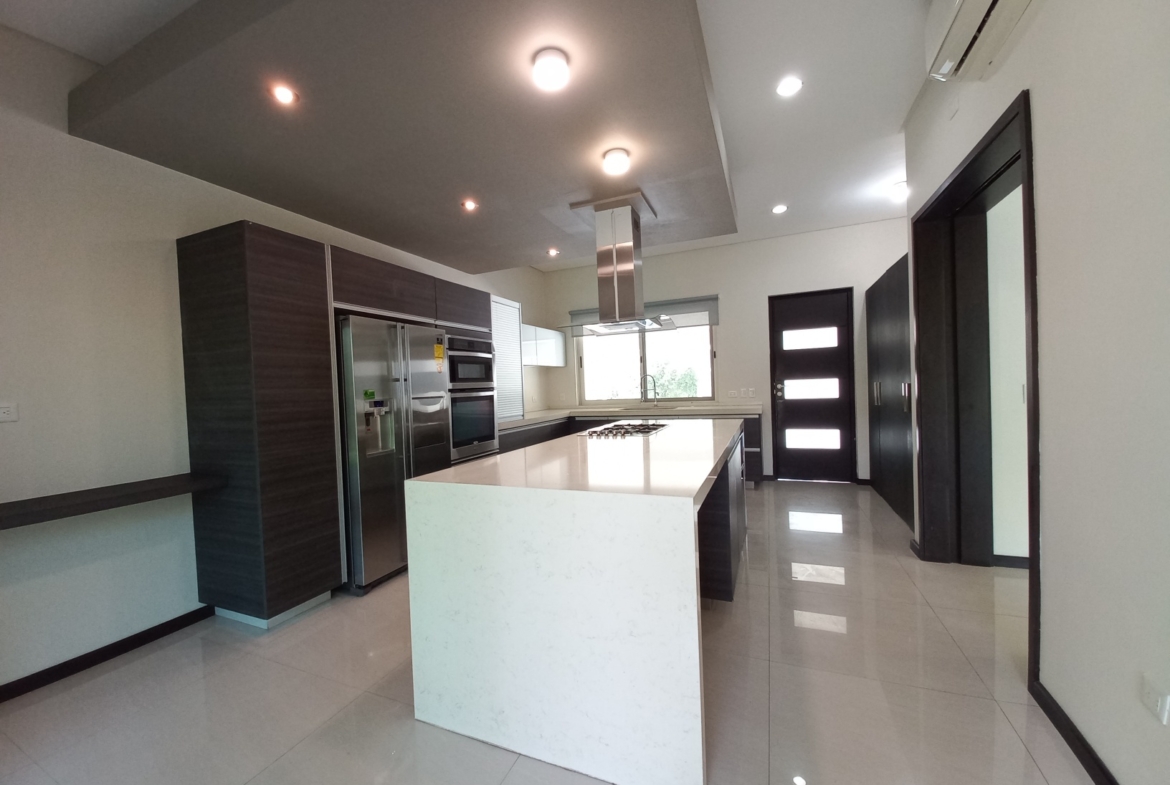 Planta Baja: cochera triple, recibidor, sala-comedor con salida a jardín, oficina/estudio, medio baño de visitas, amplio salón de juegos o sala de cine con salida a jardín. Cocina integral de lujo super equipada con refrigerador, isla y barra desayunadora con salida a terraza techada y jardín.